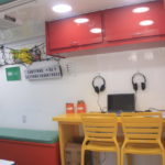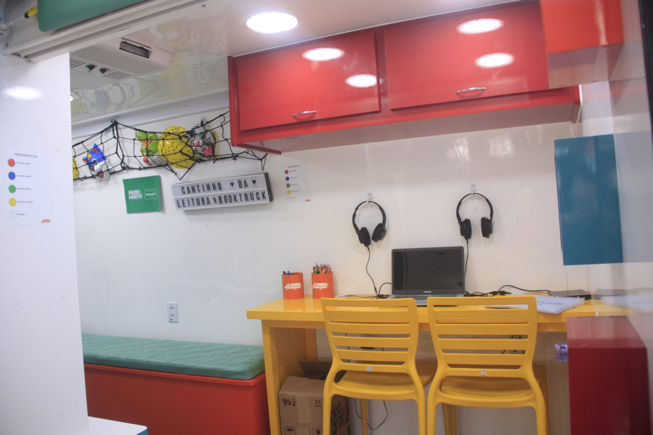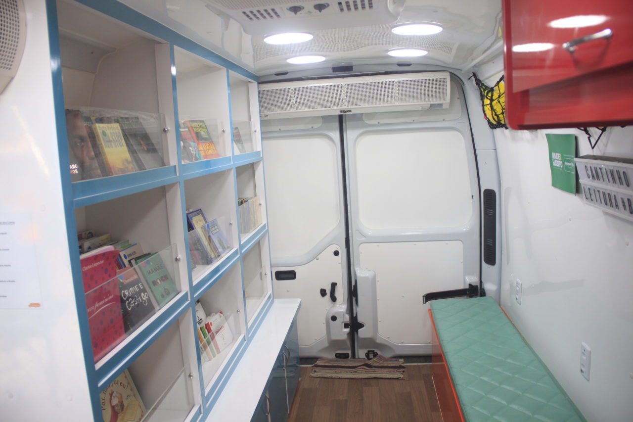 O interior do furgão oferece uma sala de leitura climatizada com acervo de livros para todas as idades e mais áudio livros e exemplares em braile para os visitantes cegos ou com baixa visão. Além disso na área externa, oferece um espaço de convivência e lazer equipado com mesas, cadeiras, pufs, almofadas e tapetes de leitura.